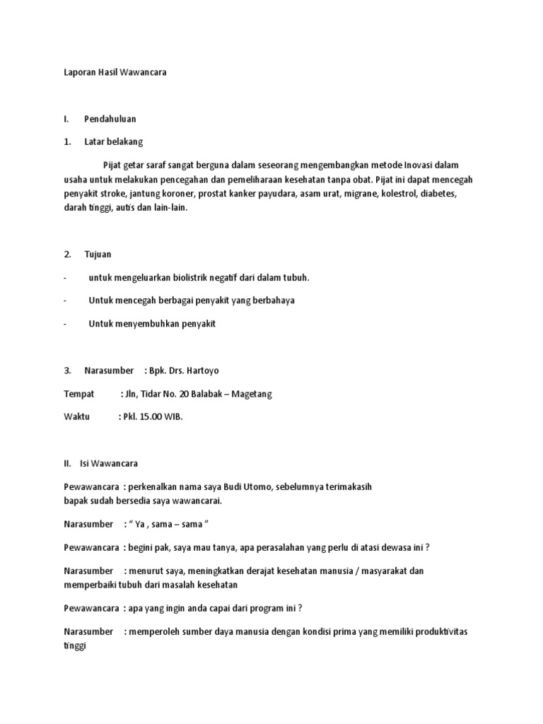 Kepala sekolah ma raudlatul muttaqin kemampuan siswa dalam mengikuti pembelajaran bahasa arab khususnya maharah qiraah, tidak terlalu aktif, hal yang melatar belaki ini adalah segian banyak dari siswa adalah bukan dari pondok yang notabenny Jul 26, 2021 · dalam wawancara terstruktur pertanyaan yang dibuat sedemikian rupa sehingga responden dibatasi dalam memberikan jawaban kepada beberapa alternative saja.jawaban yang paling mudah terhadap pertanyaan terstruktur adalah "ya" atau "tidak".beberapa contoh dari pertanyaan terstruktur adalah: Oct 21, 2020 · the key to your interview success is review, review and review. Dengan mengetahui 30 contoh pertanyaan wawancara kerja dan jawabannya di atas, anda dapat mempersiapkan diri dengan baik dalam menghadapai wawancara kerja. Contoh laporan wawancara beserta pedomannya juga.